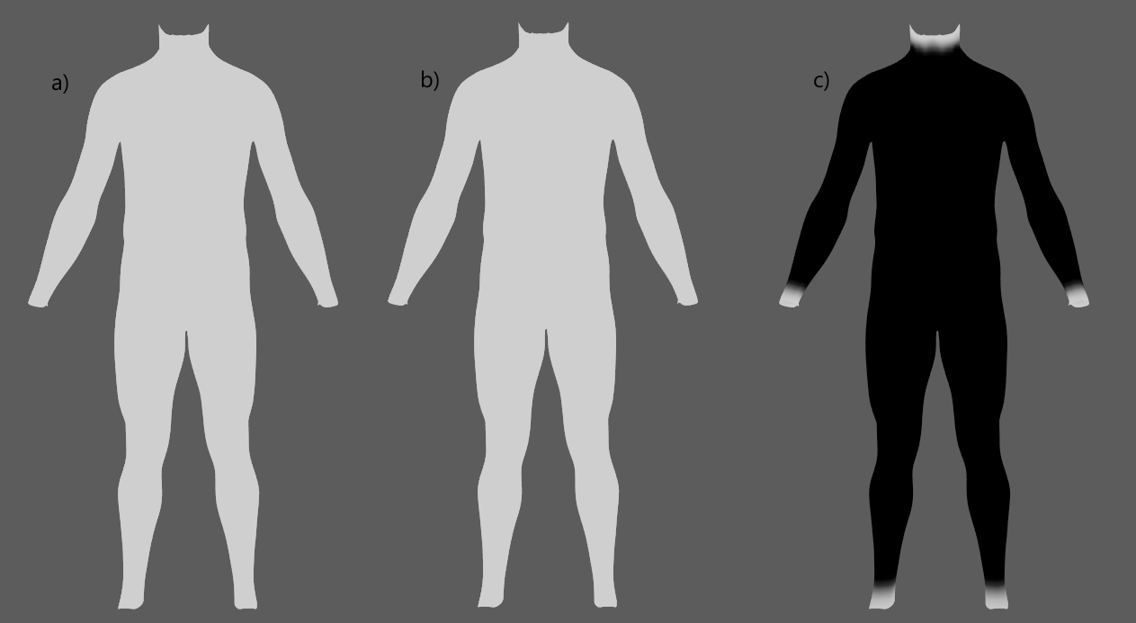 • Tip: Only if the volume between the fat mesh and the base mesh on the edges is big (e.g. wrists, ankle, neck) then it might be useful to paint a value of 1.0 in those areas.